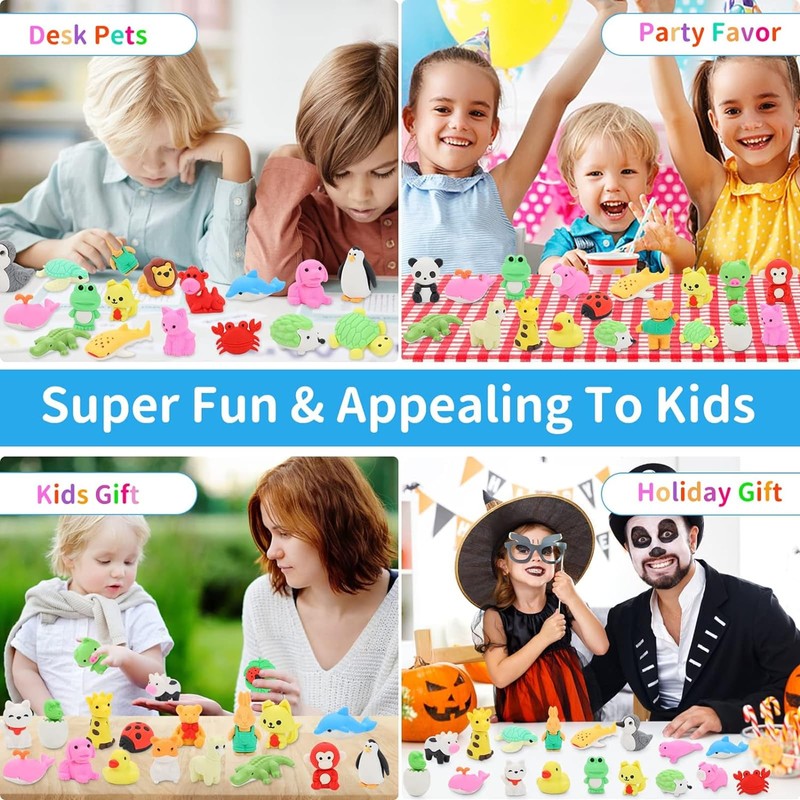 - PACK OF 36 DIFFERENT ANIMALS Your kids will love these cute animal erasers. (Note: only these animals can be random color, which is normal.)