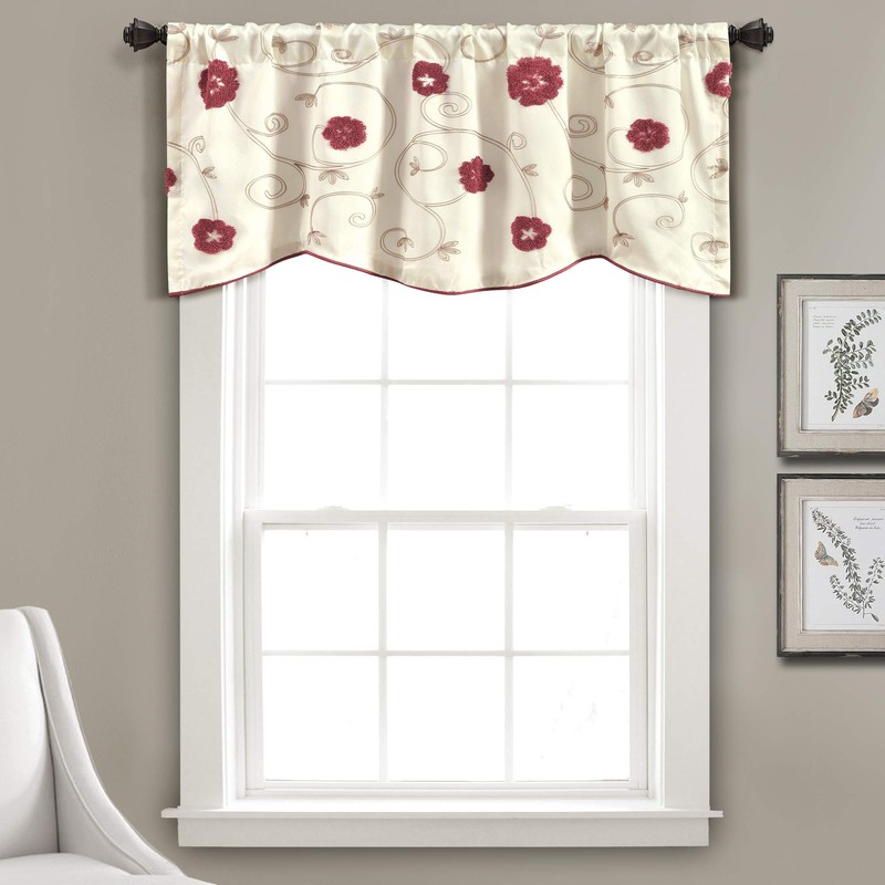 - Elegant, simple design with scalloped and trimmed bottom edges and floral embroidery adorn this window curtain valance.
