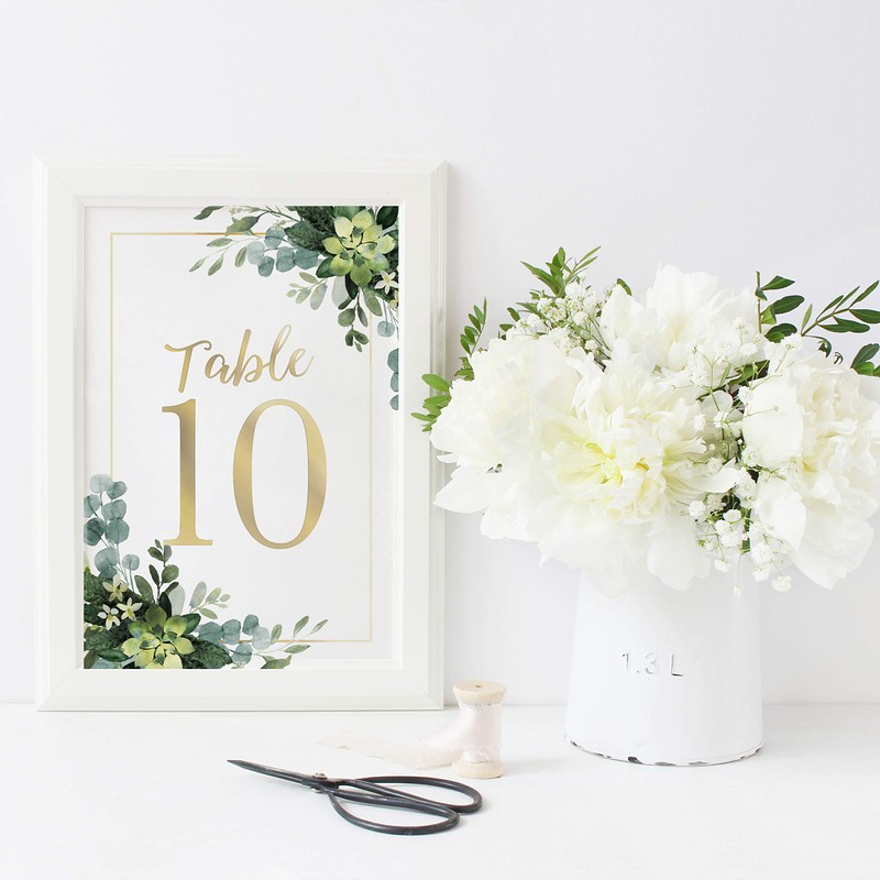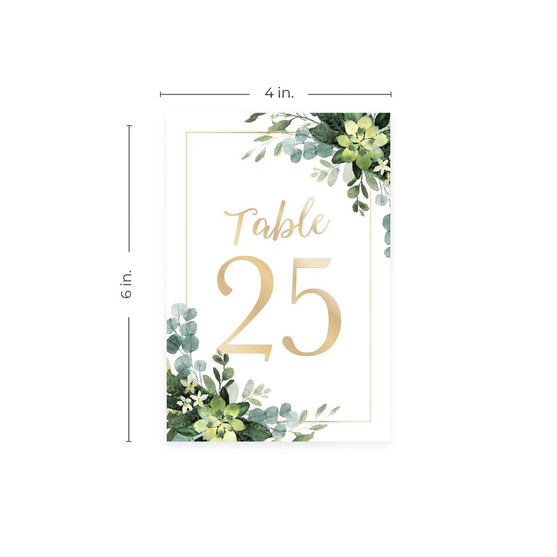 Lush Greenery Table Numbers/Set Of 28 Wedding Table Number Cards / 4" x 6" Flat Watercolor Eucalyptus Design With Faux Gold Accents/Made In Canada