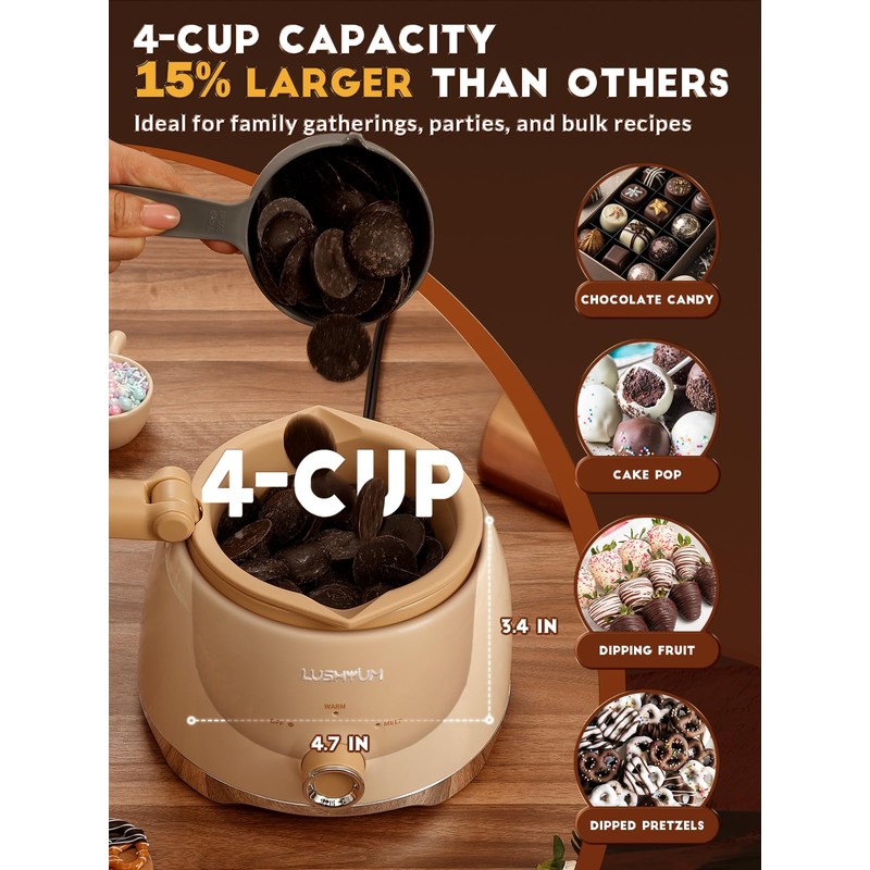 • 4 Cups Larger Capacity: With a 4-cup capacity (32 oz), this candy melter is perfect for large batches of treats. Whether you're making cocoa bombs, chocolate-dipped goodies, or treats for a party, you can melt all the chocolate you need in one gono reheating, no hassle! Save time and enjoy the fun with family and friends as you create delicious confections together.