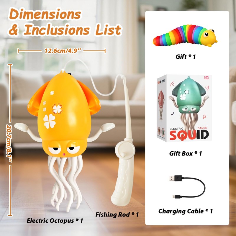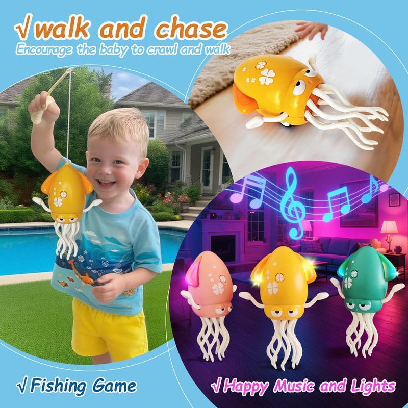 - Multifunctional Play with Fishing Rod Included:Beyond dancing and crawling, it comes with a detachable fishing rod that can be mounted on the octopus. Kids can imitate "catching marine animals," enhancing engagement, inspiring imagination, and exercising fine motor skills and concentration through diverse gameplay.