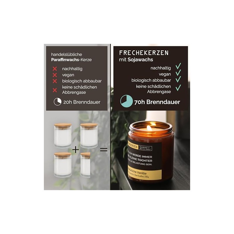 - SOJAWACHS DUFTKERZE: Kerzengröße: 9,2 x 7,3 cm; Gesamtgewicht: 420g. Jede Kerze wird schmunzelnd von uns in Berlin hergestellt. Unsere Kerzen bestehen aus 100 % natürlichem Sojawachs und haben einen Baumwoll-Docht.