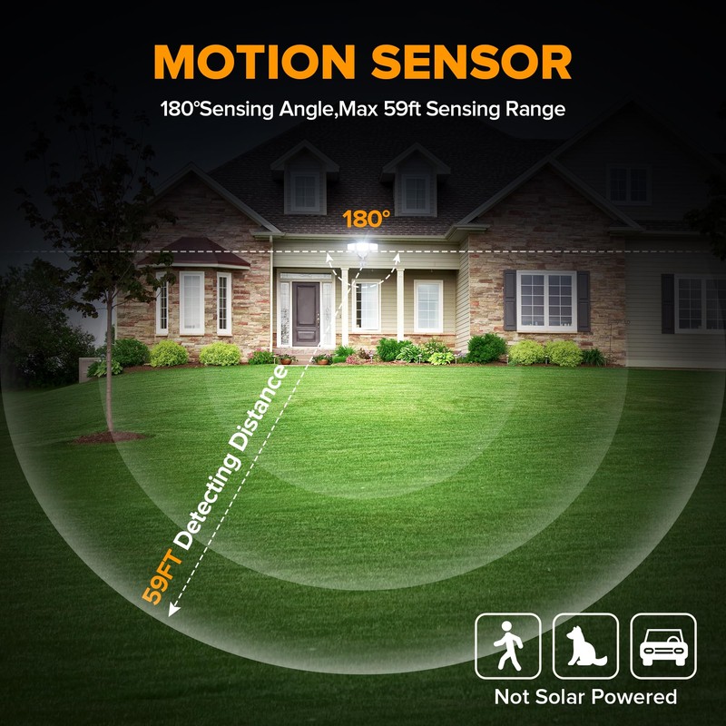 - 【MOTION ACTIVATED】Our outdoor security light provides a wide detecting angle of 180 degrees and a detecting distance of up to 59 feet, detecting motion more accurately with its sensitive motion sensor, catering to your heightened usage requirements and a wider array of application scenarios.