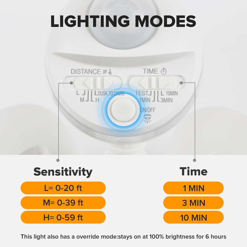 - 【4 LIGHTING MODES】Test Mode, Security Mode, Dusk to Dawn Mode and Manual Override Mode. Manual override mode allows light to operate constantly for the selected time. More choices can meet different demands of each customer. Choose the most appropriate mode for your needs and desires.
