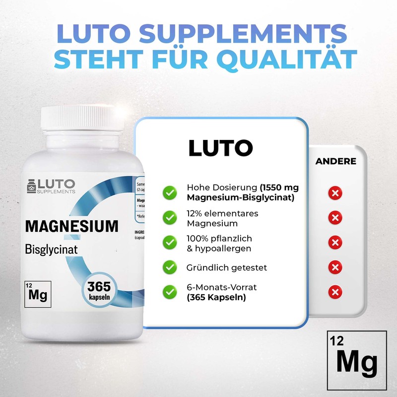 ProduktbeschreibungenLUTO Supplements Magnesium-Bisglycinat ist die beste Wahl f??r alle, die ein leistungsstarkes und effektives Magnesiumpr?parat suchen. Dieses Supplement enth?lt beeindruckende 1550 mg Magnesium-Bisglycinat pro Dosis, was eine hohe Aufnahme und maximale Wirksamkeit gew?hrleistet. Dank der hervorragenden Bioverf??gbarkeit von Bisglycinat kann dein K?rper die Vorteile von Magnesium optimal nutzen ?C ganz ohne unn?tig hohe Dosierungen. Diese hochwertige Formel unterst??tzt die Muskelfunktion, Energieproduktion und das normale Funktionieren des Nervensystems. Zudem ist sie besonders magenfreundlich und frei von unn?tigen Zusatzstoffen, sodass du ein reines und effektives Produkt erh?ltst ?C ganz ohne k??nstliche F??llstoffe. Mit 365 Kapseln pro Packung reicht dieses Supplement f??r ein ganzes Jahr und bietet eine langfristige Versorgung, ohne dass du st?ndig nachbestellen musst. Dank der optimalen Dosierung und hohen Bioverf??gbarkeit ist LUTO Supplements Magnesium-Bisglycinat die ideale Wahl f??r alle, die ein zuverl?ssiges und hochwertiges Magnesiumpr?parat suchen.Inhaltsstoffe / ZutatenMagnesiumbisglycinat, Hydroxypropylmethylcellulose (Kapselh??lle)GebrauchsanweisungMagnesiumbisglycinat, Hydroxypropylmethylcellulose (Kapselh??lle)