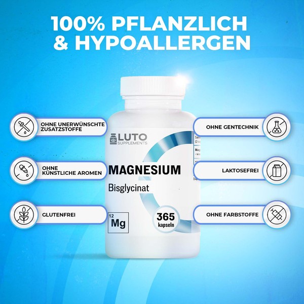 Luto Supplements Magnesiumglycinat ?C 365 Kapseln ?C 186 mg elementares Magnesium pro Tagesdosis ?C Bisglycinat/Glycinat ?C LUTO Supplements