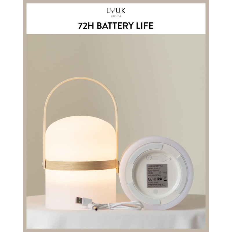 LUUK LIFESTYLE Designer LED Table lamp, Cordless Rechargeable, Portable Garden lamp, Three-Way Adjustable Brightness, IP44 Waterproof, up to 72 Hours Autonomy, Indoor and Outdoor use, Wooden Handle