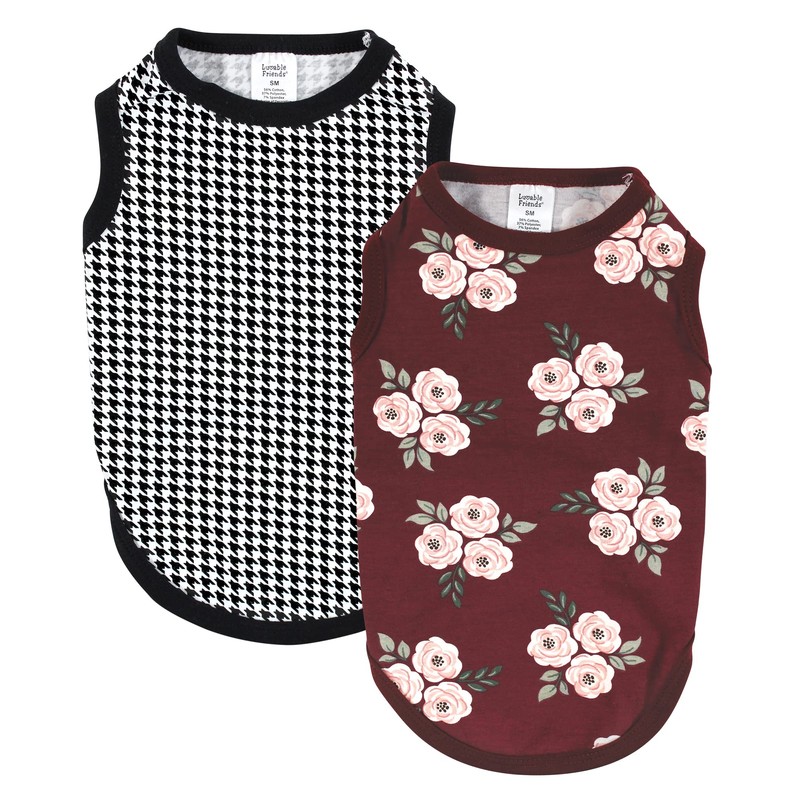 Luvable Friends Dog Pet Dog and Cats Cotton T-Shirts 2pk, Burgundy Floral Houndstooth, Large