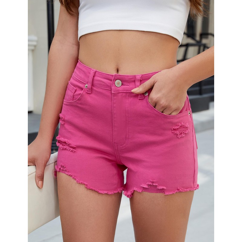 - Featuring a high-waisted silhouette, our ripped denim shorts for women come with a zip fly, button closure, and five bassic pockets. Distressed detailing and a raw hem add a playful, trendy touch to the design