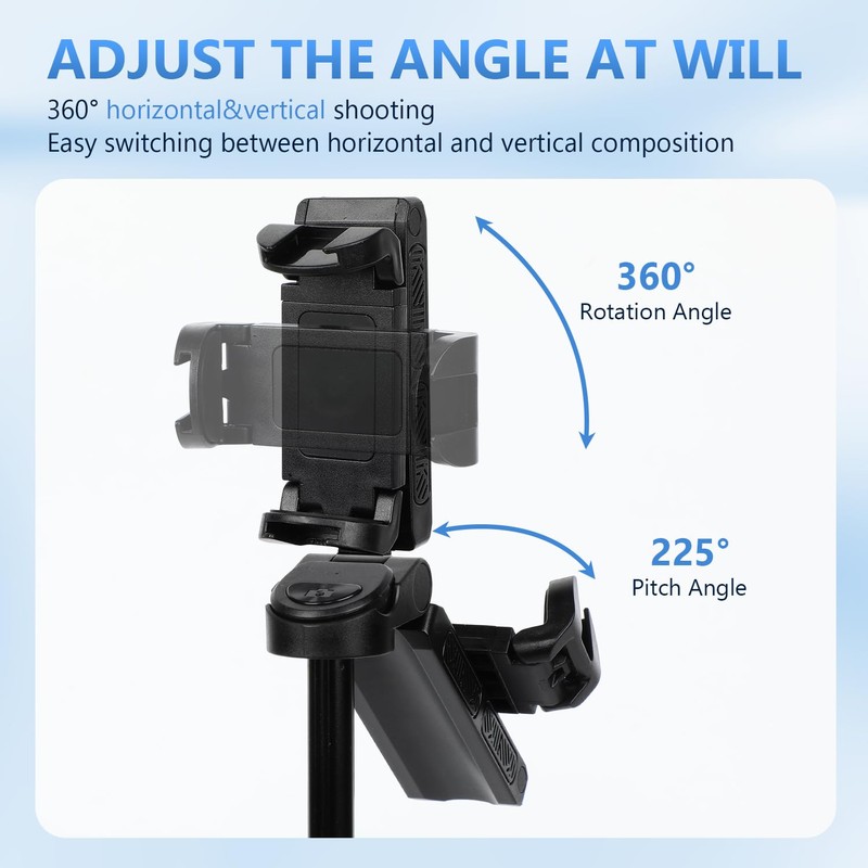 - 360 RotatableThis smartphone holder can firmly clamp the phone up and down and slide it up and down, and can switch the direction of the phone portablely, and can rotate vertically and horizontally. The phone clamp distance is 60-85mm, the rotation angle is 360, and the pitch angle is 225