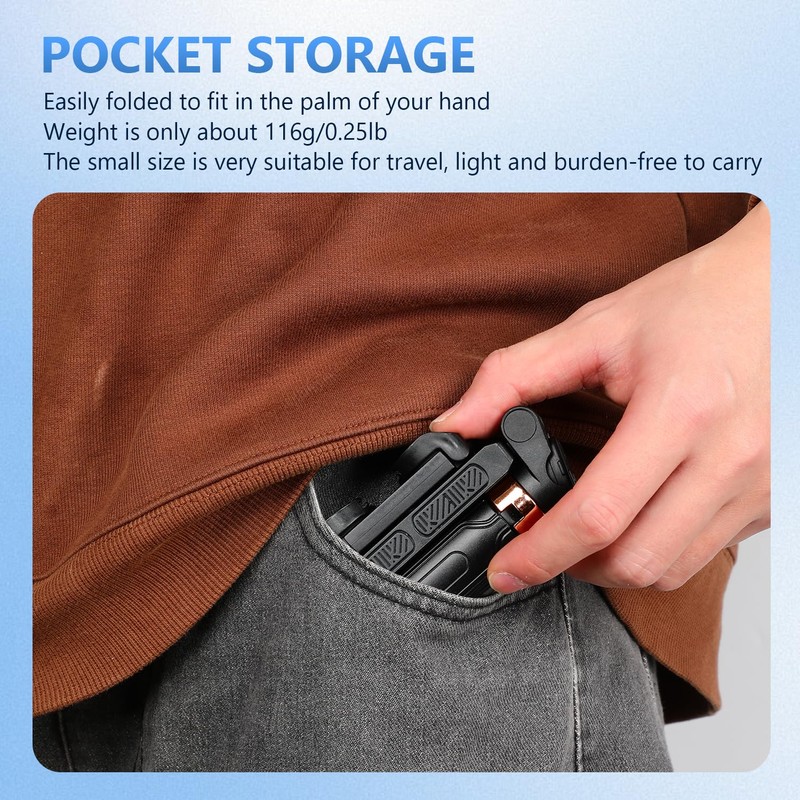 - Pocket StorageThis selfie stick can be folded and stored to the size of a palm, weighing only about 116g/0.25lb. The small size is very suitable for travel and is light and burden-free to carry