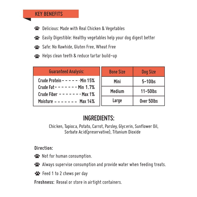 - Healthy & Limited Ingredients: The Rawhide Free Dog Chew Bones are made with less than 11 wholesome ingredients. It is packed with Real Chicken and Wholesome Vegetables such as Carrot, Parley and Potato.
