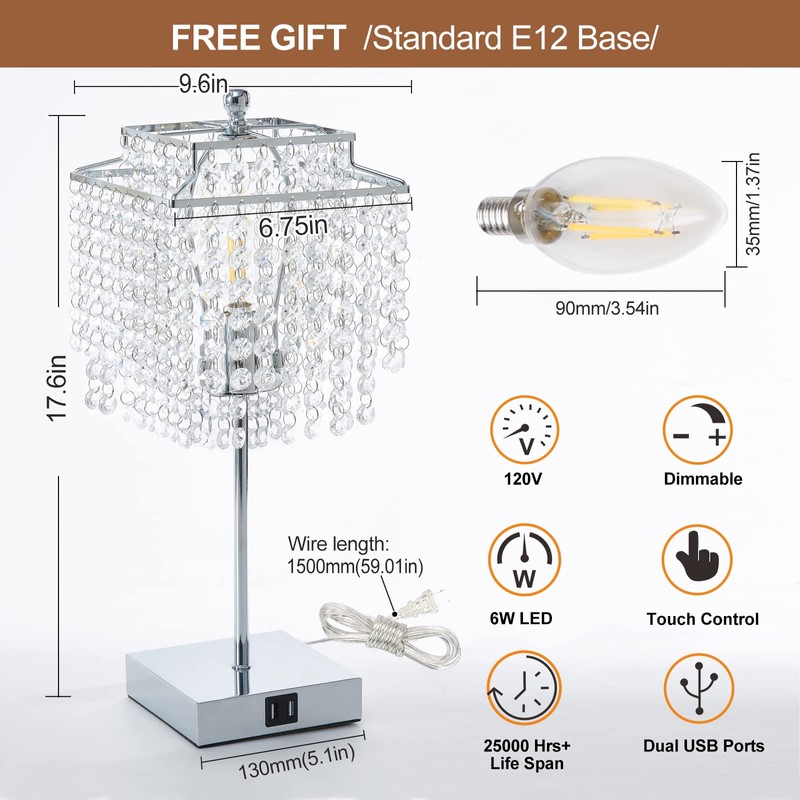 Luvkczc Luvkczc Crystal Table Lamp with Touch Control and USB for Bedside, 3-Way Dimmable with Crystal Shade for Bedroom, Living Room, 6W LED Bulb Included