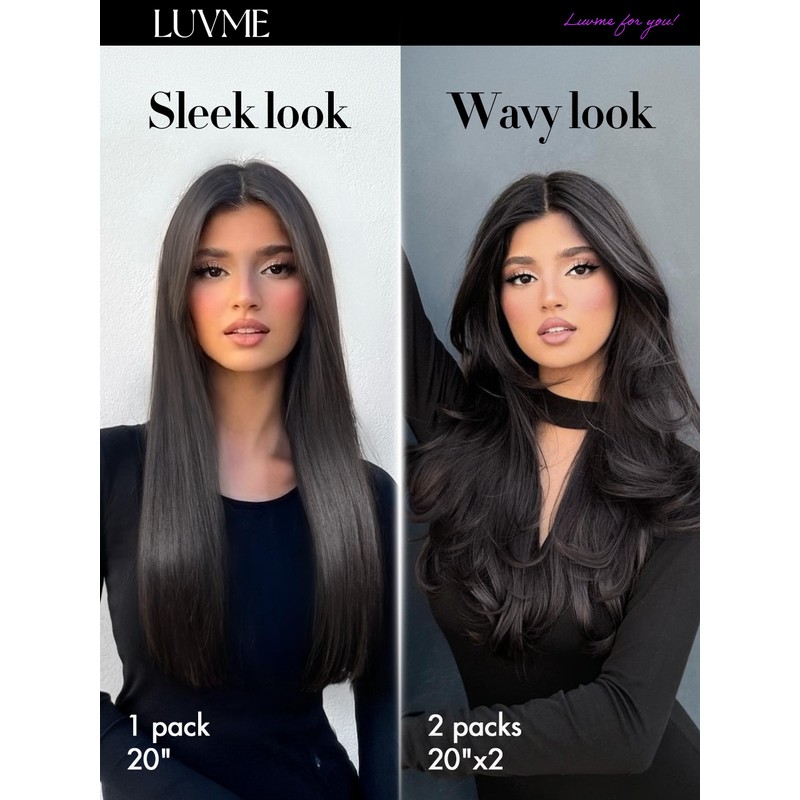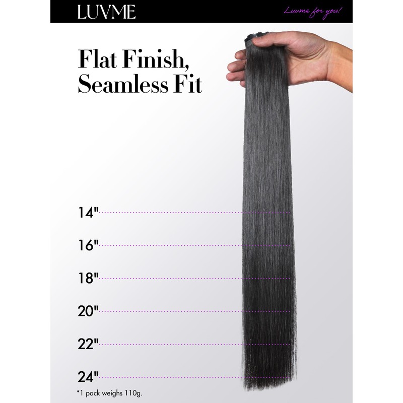 - Transform Your Look with LUVME 100% Brazilian Remy Hair Extensions: Available in 7-piece (110g) sets. Choose from 16 to 24 inches for the perfect length and volume. Each pack delivers full, natural-looking fullness. Packaging includes 7 pieces for 14-24 inch lengths, along with a flat iron, 2 double-hinged hair clips, and a mesh bag for easy storage and styling