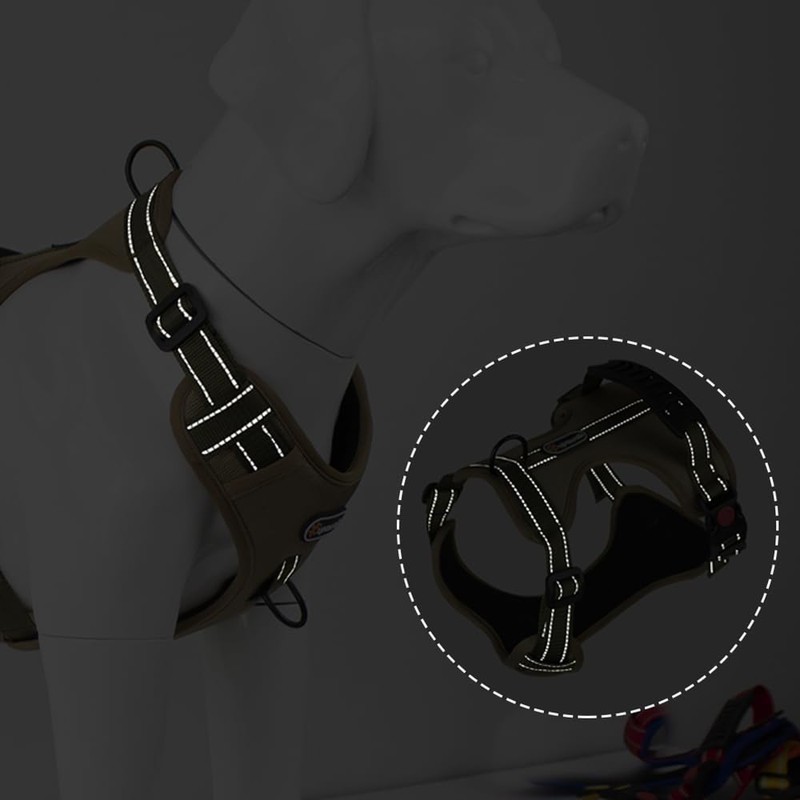 - Reflective stitching across the harness increases visibility during nighttime or low-light walks. Whether you’re on an early jog or late walk, this feature helps keep both you and your dog safer by alerting drivers and pedestrians to your presence.