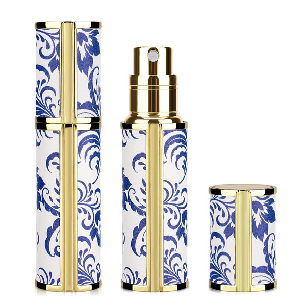 LUWOO Tragbare Parfümflasche für Reisen, 5 ml, Mini-veganes Leder, auslaufsicher, nachfüllbar, Parfümspender, Zerstäuber, Blau und Weiß