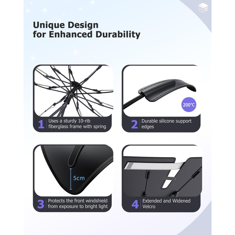 - Fiberglas-Schirmstreben, Silikonsttzstreifen Dieser Autosonnenschirm verwendet 10 hochfeste Fiberglas-Schirmstreben. Der Rahmen kann um 90 Grad gebogen werden, ohne zu brechen, und ist robust, langlebig und korrosionsbest?ndig. Each umbrella strut with silicone to prevent scratches on the interior. Die Silikonsttzstreifen sind bis 200C hitzebest?ndig und ihre Haltbarkeit ist dreimal so hoch wie die von normalen Lederstreifen, was einen zuverl?ssigen Schutz fr Ihr Fahrzeug bietet.