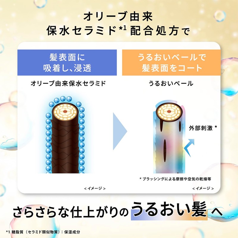 - Olive derived water retaining ceramid*³ formula. Each hair is wrapped in a moisturizing veil, and it retains water and keeps it in place even though it has a light finish. *³ Sugar Fats: Moisturizing Ingredients