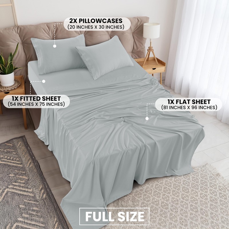 - 4-Piece Full Sheet Set - Includes 1 flat sheet (81" x 96"), 1 fitted sheet (54" x 75", fits mattresses up to 16"), and 2 pillowcases (20" x 30" + 4"). Sized for guest rooms or everyday beds with a smooth, tailored fit.