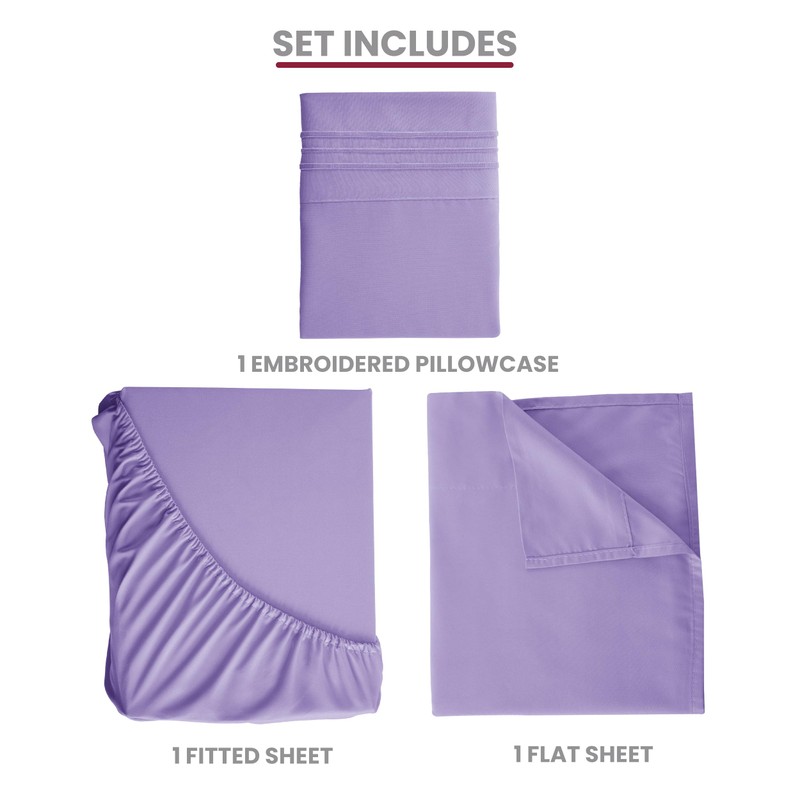 - 3 Piece Sheet Set: Twin sheet set includes 1 flat sheet (66 x 96), 1 fitted sheet (39 x 75 inches), and 1 embroidered pillowcase (20 x 30 + 4 inches) Available in multiple colors to match your room's décor