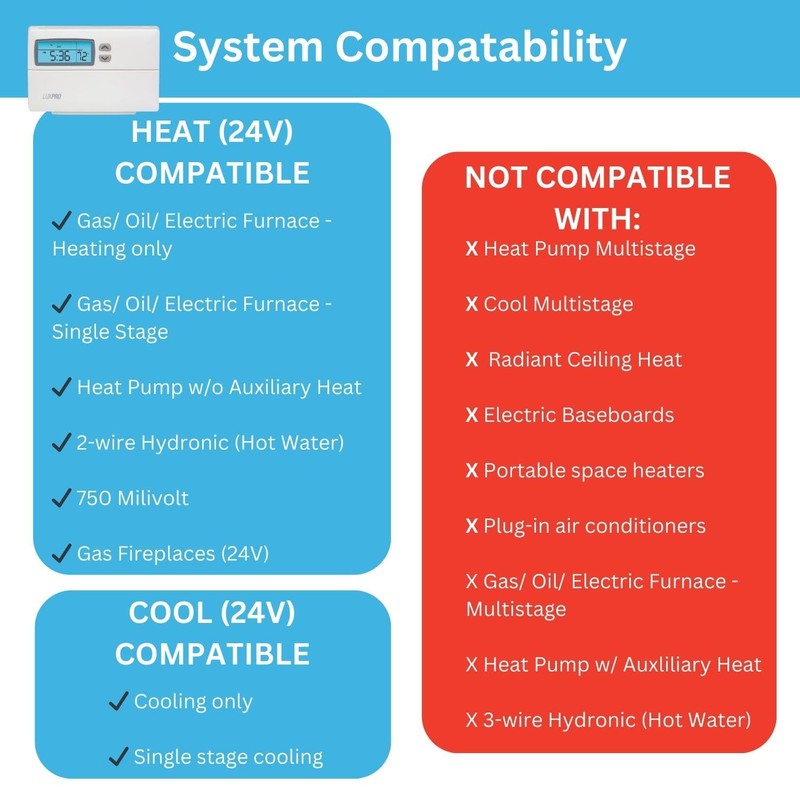 • Separate programs for heating and cooling. Not Compatible With-Multi-stage heat pumps, Multi-stage gas or oil furnaces, 3 wire hydronic systems,120V/240 line voltage systems (without transformers)
