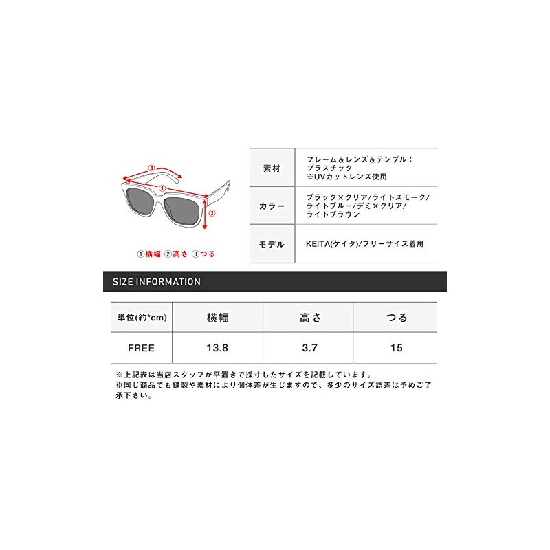 - [Materials] Lens & Frame & Temple: Plastic *Uses UV protection lenses
