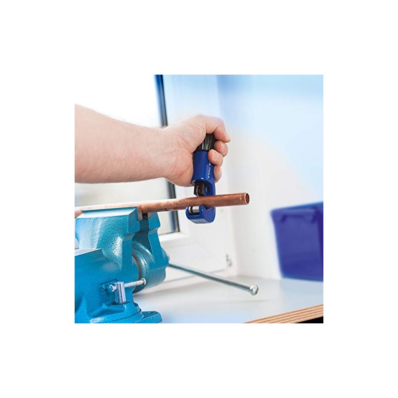 With the handy LUX-TOOLS Comfort pipe cutter, you can reliably shorten pipes in heating and sanitary installation. It is suitable for pipes made of copper, brass and aluminium as well as thin-walled steel pipes. The robust cutting tool has a reliable quality for recurring use in the DIY sector. It is made of plastic and cast metal. It is equipped with two guide rollers that avoid slipping on the round tube. Fixation and width adjustment are done by tightening the non-slip thumb screw. With the help of circular movements, the cutting wheel is moved over the pipe and cuts it. The pipe cutter can be used for pipes with outer diameters from 3 mm to 35 mm. The compact design of the pipe cutter allows you to work within a small swivel radius.
