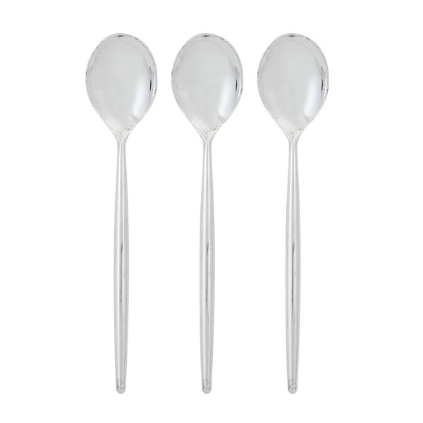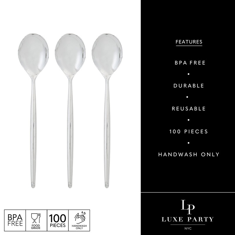 Luxe Party 100 Pieces Premium Plastic Disposable Spoons | Matrix Collection | Solid | Full Size | Metallic Silverware | Smooth Finish | Silver