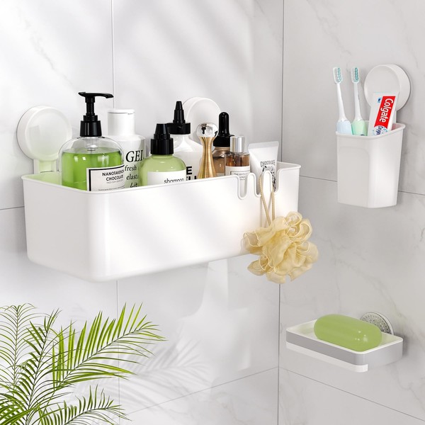 Luxear Strong Suction Shower Caddy No Drilling Shower Shelf Basket Removable Shower Storage Rustproof Waterproof for Bathroom Wall Shampoo Razors Soap with Drainage Design and Hooks 3Pack- White