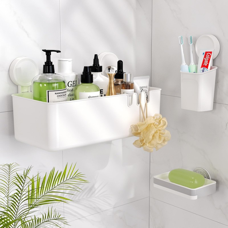 - VERSATILE HANGING HOOKS: Features grooves hooks for hanging razors, bath sponges, hair ties, necklaces, and more.Say goodbye to cluttered showers and hello to a more organized and stylish bathroom with the Luxear Suction Shower Caddy. Upgrade your shower experience today!