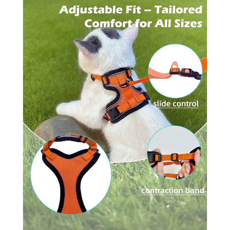 Explore the outdoors safely with your feline companion using our Escape-Proof Cat Harness and Leash Set, designed for both comfort and control. After 4 years of development and 50,000 real-world tests, this harness stands out with its double-layered escape-proof structure, featuring 2 quick-release buckles and 2 sliding straps to provide a secure and customizable fit. Putting the harness on your cat is quick and easy. The over-the-head design, combined with dual side-release buckles, allows for a smooth, hassle-free setup that keeps your cat secure without causing discomfort. Ideal for cats who are active, curious, or sensitive to tight restraints. Your cat’s safety is our top priority. The harness features an ergonomic design with 5 pull dispersion points, distributing leash tension evenly to prevent pressure points and neck strain. Reflective strips enhance visibility at night, making this harness perfect for evening walks or early morning adventures. Comfort is just as important. That’s why we use A+ grade breathable mesh fabric that’s soft, lightweight, and well-ventilated. Combined with a curved neckline, the harness ensures a pleasant fit during extended outdoor activities—your cat stays cool, comfy, and calm. Available in XS, S, and M sizes, this cat harness offers a tailored fit for kittens and adult cats alike. It’s adjustable to your pet’s body for a secure hold that prevents slipping or escape. Give your pet the freedom to roam—with your peace of mind intact.