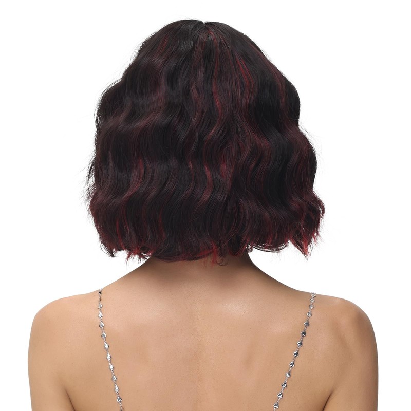 Luxiremi Wigs Red Mixed Black Short Curly Wavy Wig Bob with Fringe Synthetic Hair Cosplay Wig for Women