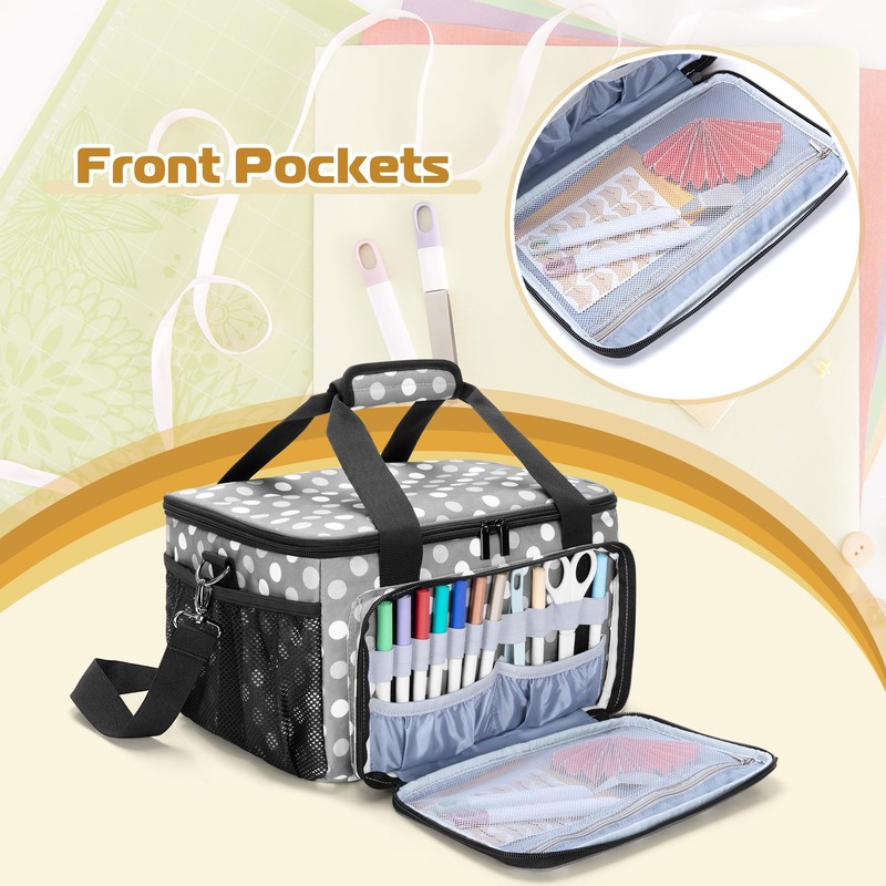 • ACCESSORIES POCKETS: The front section with a mesh zipper pocket and multiple elastic loops provide ample space for Cricut pens and basic tool set. 2 side pockets are convenient too.