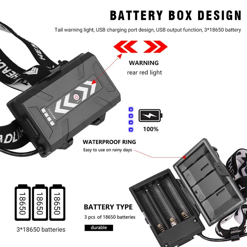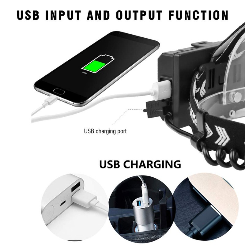 - 【USB INPUT/OUTPUT】Powerful head torch comes with 3pcs 18650 rechargeable batteries and USB charging cable, the rechargeable head flashlight can be charged by car charger, computer, power bank, wall charger or any USB outlet etc. 5V2A adapter will be better. Besides, it can be used as a power bank to charge your phone in emergency. At first time use, please remove the plastic wrap off the batteries, otherwise they can't connect well to recharge.