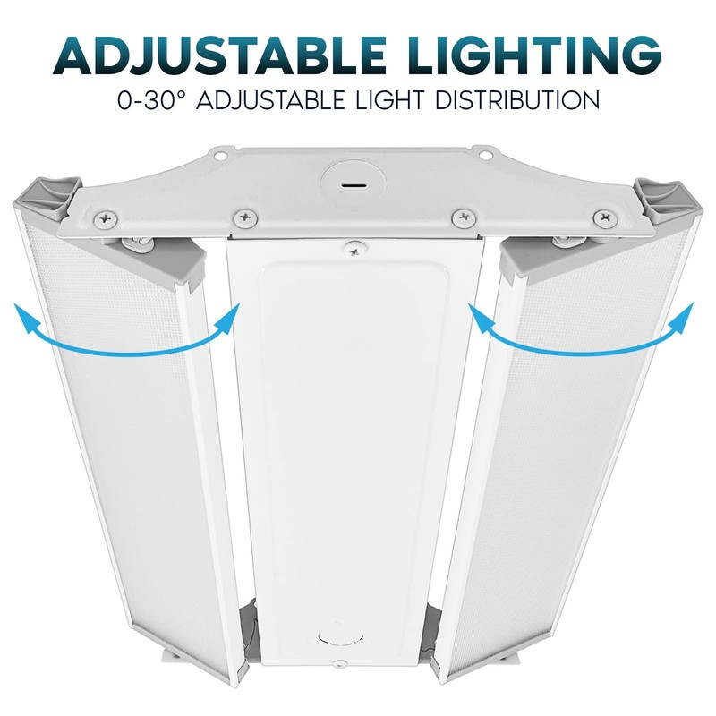 - ADJUSTABLE ANGLE LIGHTING - Don't be limited to standard high LED shop lights that only shine directly down onto your space. With our workshop hanging light, you'll be able to tilt the lighting on both sides from 0 to 30 degrees to your desired location. Take full advantage of the high lumen production from each LED linear shop lights to brighten your area to your preferred setting. Ideal for use in a warehouse, large garage, work shops, auto body shop, factories, gyms, stadiums, and more.