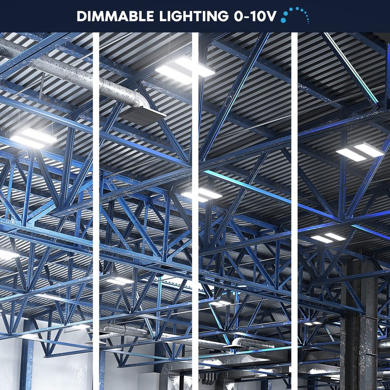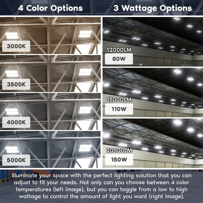 - POWER SELECTABLE - Having the correct amount of light in your shop or warehouse can be a difficult task if you are not sure how bright you need your lights to be. Each high output LED shop lighting fixture has a switch to adjust the wattage which adjusts how bright the light is, similar to a 3 way bulb. Select 80 watts, 110 watts, or 150 watts for up to 20,500 lumens of quality lighting to illuminate your area. These can also be used with a 0-10V dimmer for more control of your light output.