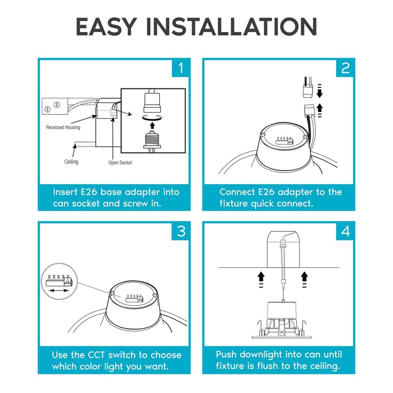 - 5 COLOR OPTIONS - Not sure what square recessed lighting color temperature you are looking for in your home? Each 4 inch dimmable LED downlight has a simple to use switch on the back that can change your lights to 2700K warm white, 3000K soft white, 3500K natural white, 4000K cool white, or 5000K bright white. Your home ceiling can lights will be adjustable through 5 color temperatures until you find the perfect light to select for your space.