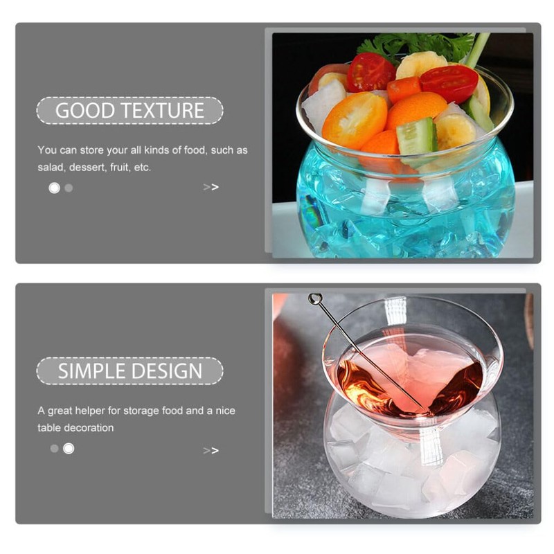 - 🍷🍷Place ice cubes or crushed ice in the lower bowl and place the upper bowl, and your food will keep chilled and fresh for hours. Its the choice for martinis. Suitable for Manhattan, Cosmopolitan, Margarita and other cocktails.