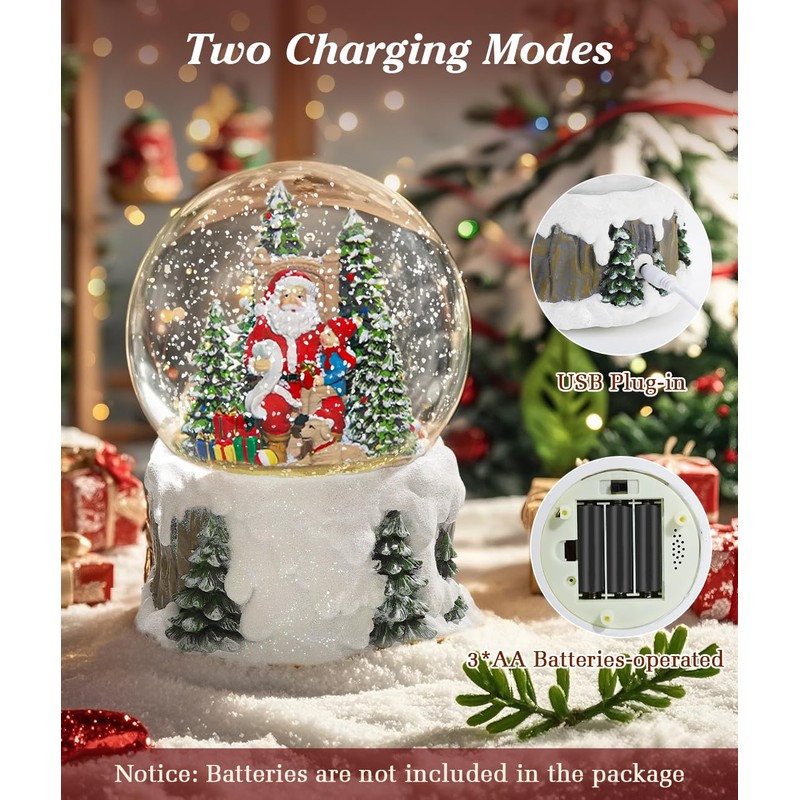 USB Plug-in & 3 AA Batteries - The Christmas snow globe has 2 charging modes including USB plug-in mode and batteries mode. You can choose from them at will.