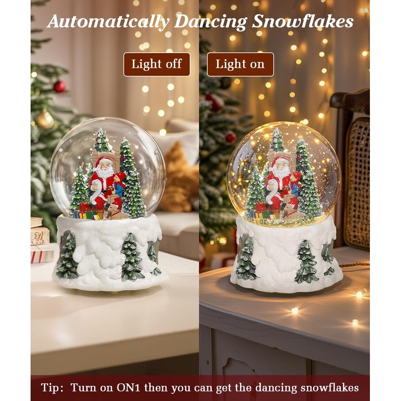 - 【Plays 8 Songs Including Jingle Bells】This snow globe Christmas has a 3 buttons (ON1 - OFF - ON2). ON1: With the light activated, the Christmas light will start to cycle through 8 non-repeating Christmas songs, a wonderful and beautiful melody to start a pleasant day for you; ON2: The Christmas light will be illuminated continuously, bringing you a vivid snowy scene.