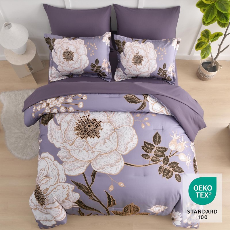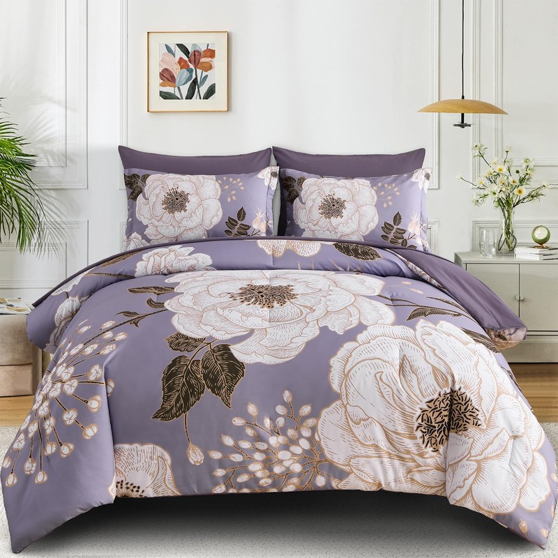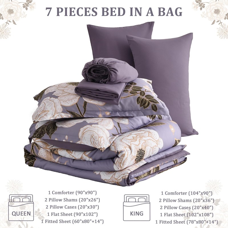 Luxudecor Floral Queen Comforter Set 7 Pieces Bed in a Bag, White Flower Print on Light Purple Bedding Set, Soft Reversible Comforter with Sheet Set 90"x90"