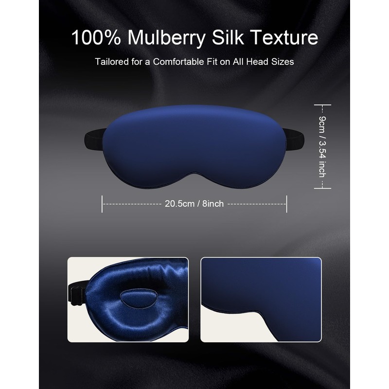 Luxury 22 Momme 100% Mulberry Silk Sleep Mask – 3D Eye Mask with Adjustable Strap, Gentle on Skin and Eyes, Provides Complete Light Blockage for Deep Sleep (Navy, Adjustable)