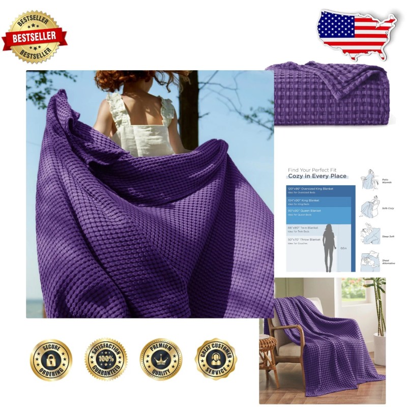 Luxury Cooling Waffle Weave Throw Blanket - Soft Bamboo Cotton, 50x70 in Purple