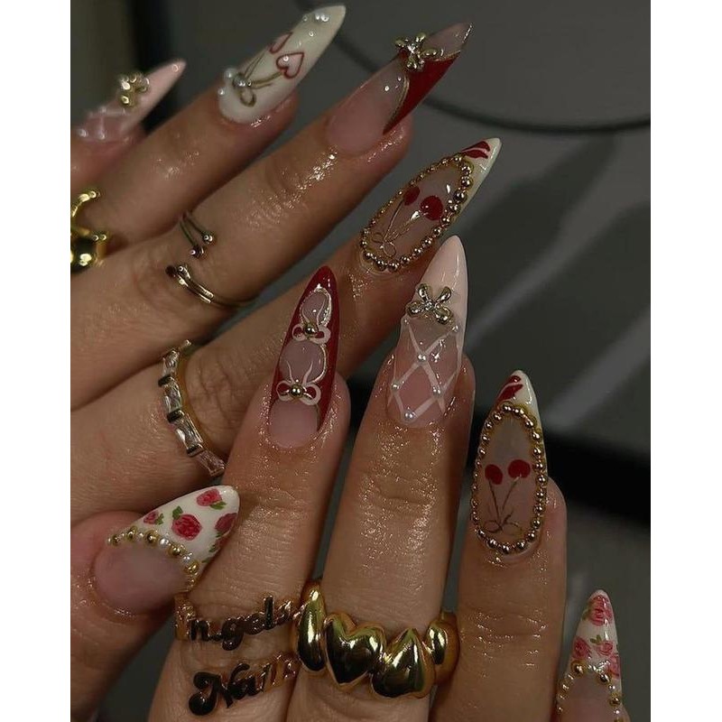 Luxury Gothic Press On Nails Handmade Red Gold French Tip 3D Romantic Nail Art with 3D Charms & Floral Details Premium Quality Materials Long Lasting Reusable Set:_Square_L
