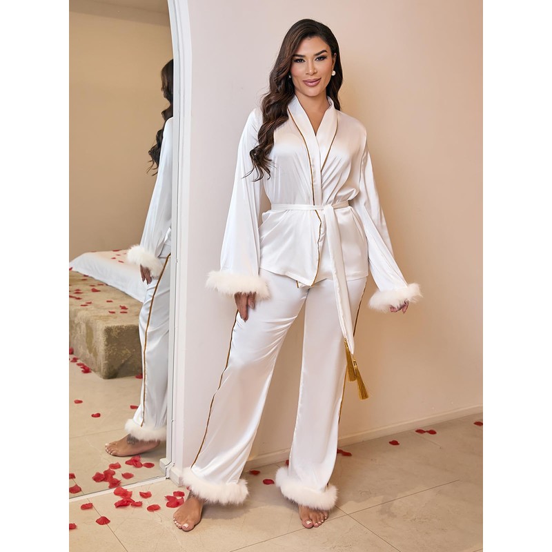 - LUXURIOUS DESIGN: Elegant white satin pajama set featuring plush faux fox fur trim on sleeves and pant hems, with sophisticated gold piping accents