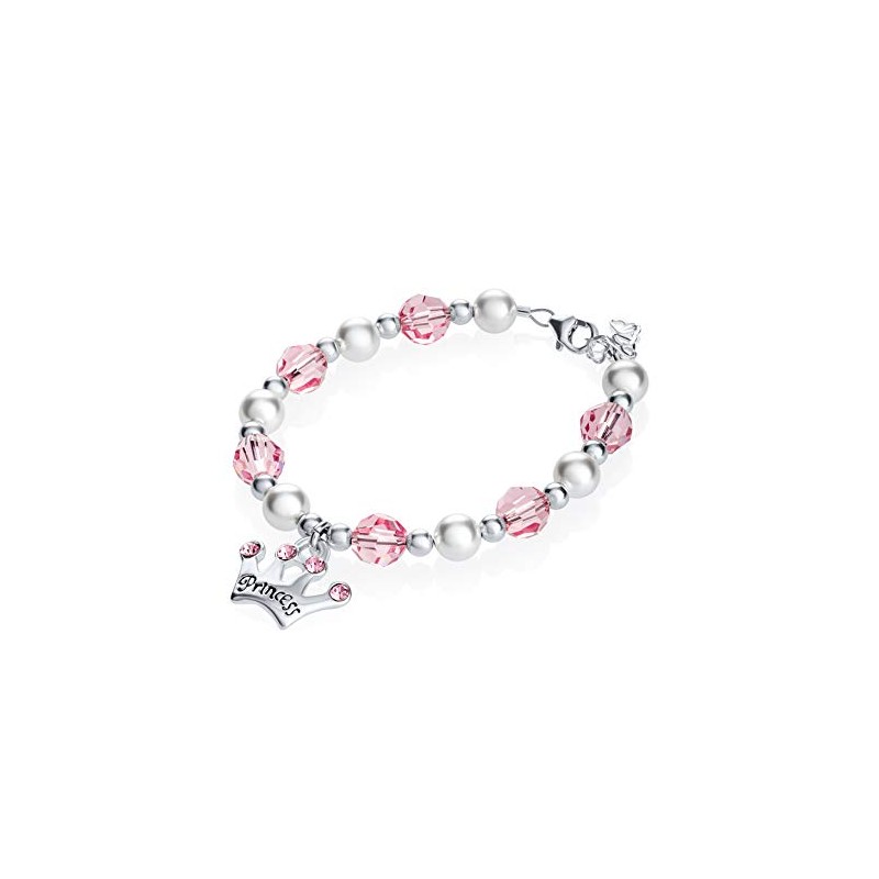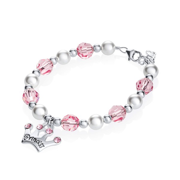 Luxury White Simulated Pearls Pink Pave Beads and Crystals with Sterling Silver Princess Crown Charm Baby Girl Bracelet (B139_S)