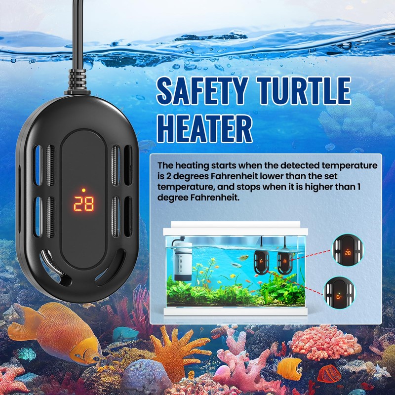 - LED Digital Display] Display real-time water temperature,easy to read and monitor temperature,The indicator light will on red when the turtle heater is heating when the LED lights up red after the heating rod is energized,it means heating taking place,When the LED light does not turn on,it means to stop heating.Temperature regulation range:59-93℉,This fish tank heater applicable water level as low as 1.4 in,compatible with more use requirements.