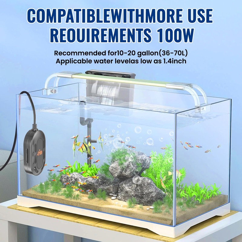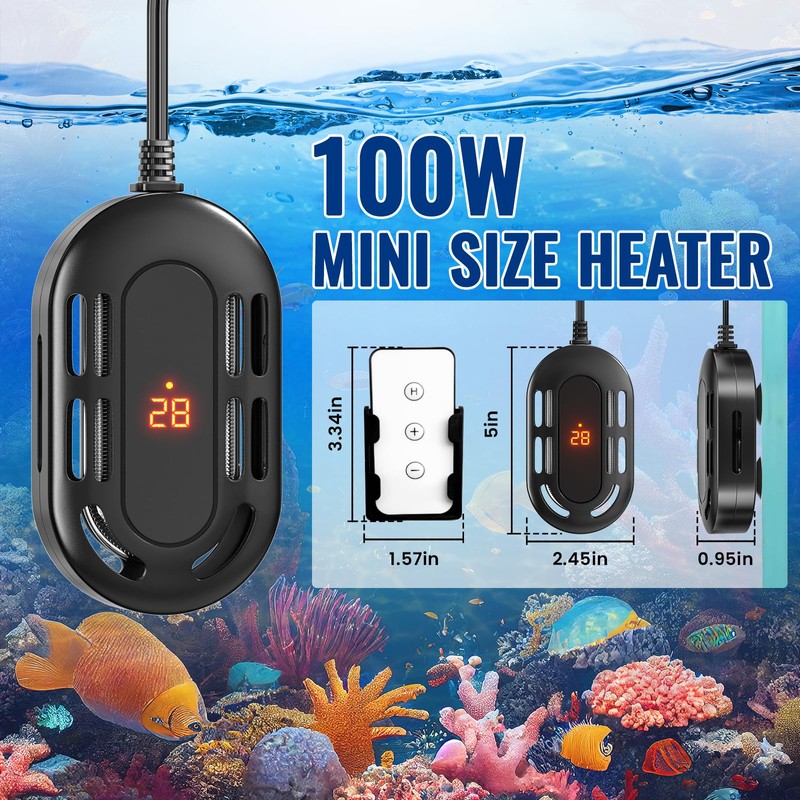 - [100W Turtle Tank Heater with remote control]T his aquarium heater is small,efficient stable and fast heating,not only include 2 strong suction cups on the back of this tank heater,which easy to fix on the aquarium,but also with remote control and remote control holder,It is easy remote operation,The 100W heater fits for 10-20 gallon tank.