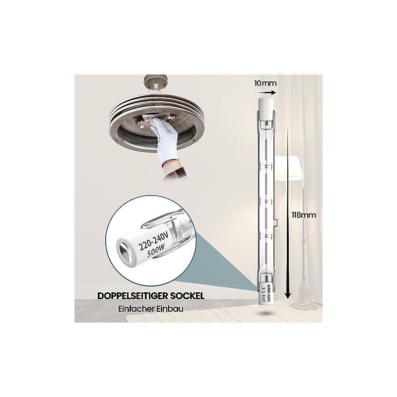 - SPEZIFIKATION: 500W, 118 mm L?nge, 10 mm Durchmesser, AC 220-240V, 11000 Lm, 2800K warmwei?es Licht, R7S 118mm lineare Halogenlampe