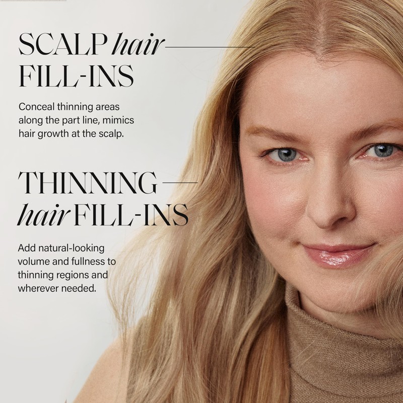 - Instant Volume Solution – Our Thinning Hair Fill-Ins feature 6 thin 12-inch seamless wefts that lay flat against your head for a boost of volume and instant coverage wherever needed. Pairs well with Scalp Hair Fill-Ins.
